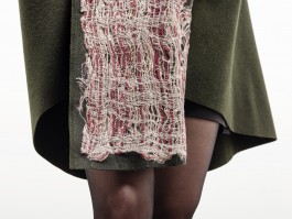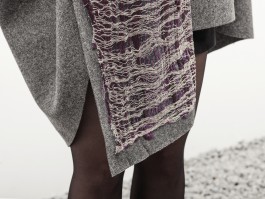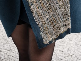The cape and right edge are decorated with hand embroidered burel. The right inside edge features hand woven linen, silk and wool.